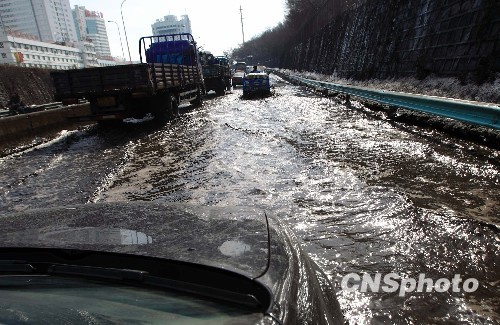 15日晚,一场雨夹雪光临乌鲁木齐市,致使道路结冰湿滑难行,随着白天气温升高,路面冰雪开始消融,致使城北区域雾气浓重。中新社发 刘新 摄