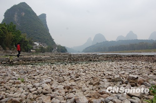 3月17日,受广西50年不遇旱情影响,漓江水位持续下降,漓江游览航线缩短。当天的游船航程已变为漓江阳朔杨堤码头至九马画山后,返回杨堤下船。游船原航程为磨盘山——阳朔。调整后的航线比原游览航线缩短了一半多,但是桂林百里漓江景区的精华航段。票价亦下浮了三分之一。桂林当局16日对外发布漓江游船航程缩短信息。图为阳朔码头露出河床的漓江。