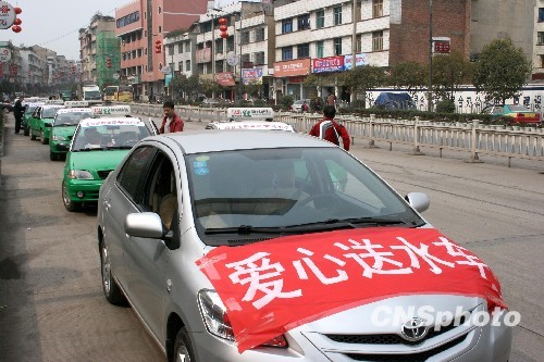 贵州福泉市文明办组织120余名爱心司机成立福泉志愿者爱心送水车队,每天组织10余辆爱心车将100桶清洁泉水送往离市区较远干旱旱情重灾区。中新社发 易胜武 摄