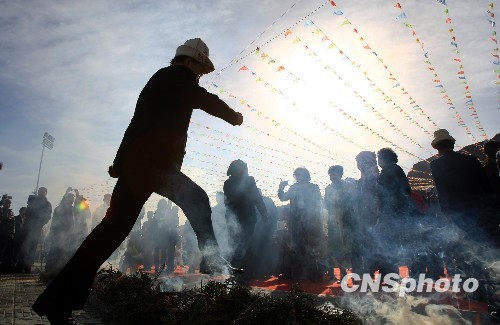 图为柯尔克孜族民众从燃烧的芨芨草上跨过,以示“驱邪”。中新社发 刘新 摄