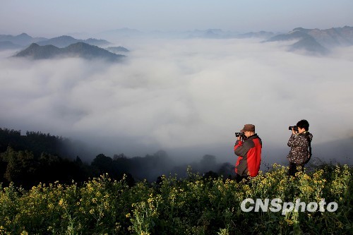 3月19日,游客在皖南石潭拍摄云海翻腾的奇观。当日,安徽黄山市歙县石潭出现罕见的云海奇观。云海时而翻腾飞跃,将青山吞没,时而座座青峰又隐现于虚无缥缈的云山之中。中新社发 方也广德 摄