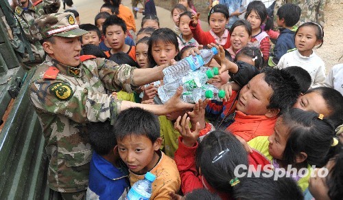 图为19日武警云南总队抗旱爱心慰问队的官兵为昆明市禄劝彝族苗族自治县武警民族希望小学送去饮用矿泉水。中新社发 李善明 摄