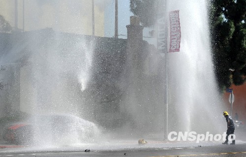 当地时间3月20日下午,洛杉矶街头发生车祸,两辆汽车在十字路口相撞,其中一辆轿车失控冲上人行道,将消防栓撞断,水柱腾空而起高达数十米,持续十几分钟,附近交通一度中断。中新社发 张炜 摄