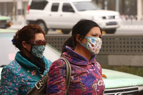 3月20日,连云港市民顶着弥漫的沙尘天气行走在街头。当日,江苏连云港遭遇今年首次强沙尘天气袭击。五级以上的北风卷起黄沙,造成天空昏暗,能见度降低,空气质量严重下降。出行的市民纷纷用口罩、围巾将自己包裹起来以抵御风沙的侵袭。中新社发 朱华南 摄