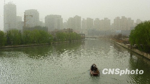 3月21日早晨,阴霾天气出现在古城浙江绍兴市区上空,整个天空看上去灰蒙蒙,如被一层薄纱笼罩着。据悉,受北方沙尘天气影响,绍兴上空出现少见的灰霾。灰霾比雾对人们健康危害更大。中新社发 李瑞昌 摄