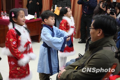 3月20日,北京市第二实验小学一年级14班国学亲子活动在北京国子监成贤国学馆举行。本次活动旨在倡导和弘扬中华优秀的传统文化,国学教育要从娃娃抓起,希望小学生们能够继承发扬中华传统文化。中新社发 郭海鹏 摄