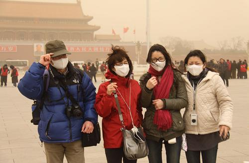 3月22日,几位游客在北京天安门广场游览。新华社发(桑全利 摄)