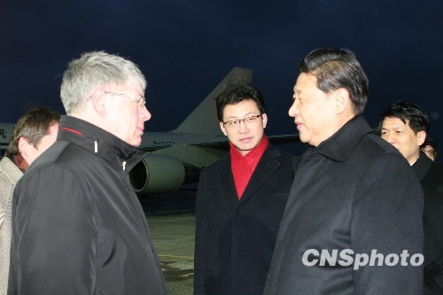 在机场,习近平(右)受到俄罗斯副外长博罗达夫金(左)的热情迎接。中新社发 田冰 摄