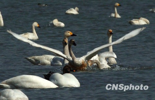 2010年3月23日,上百只北归回迁天鹅在北京颐和园昆明湖中徜徉、嬉戏、觅食。专家介绍,这批来自中国南方的鄱阳湖的天鹅将继续向北迁徙。中新社发 邹宪 摄
