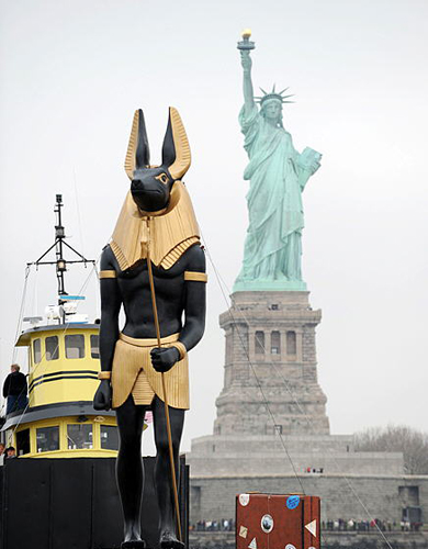 图为一尊埃及阿努比斯神雕像复制品被装载在船上运送到美国纽约。
