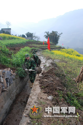 3月4日,四川省峨边民兵为受灾民众修复下大堰水渠。杨永东 梁辉 摄