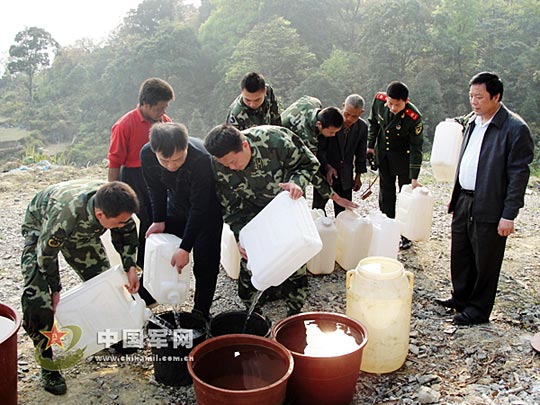 3月13日,武警百色市边防支队十一支队“抗旱小分队”为广西那坡县果梨村规林屯送水。黄旭恒 赵园毕 摄