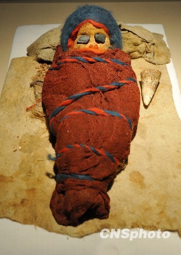 图为婴儿木乃伊“且末宝宝”,距今约2800年,婴儿年龄约8-10个月。中新社发 张炜 摄
