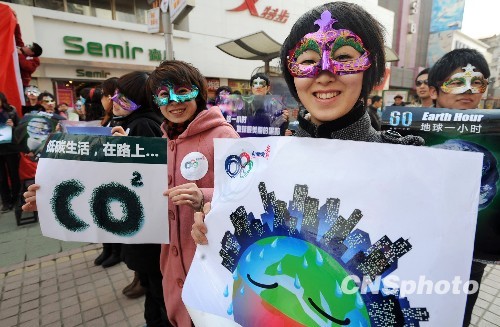 3月26日下午2点整,一群“闪客”佩戴面具并手持“地球一小时”宣传画整齐的出现在沈阳街头。中新社发 罗澜 摄