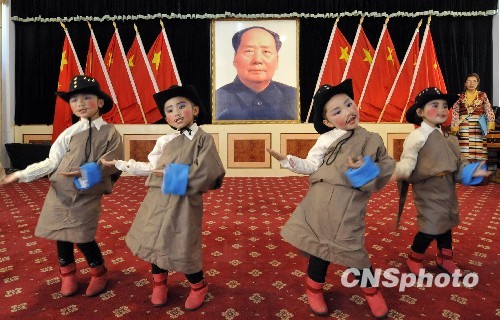 近日,随着“西藏百万农奴解放纪念日”临近,西藏拉萨市城关区策门林社区居委会组织幼儿园小朋友表演精彩节目,迎接纪念日。中新社发 旦增 摄