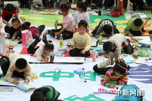 中新网3月28日电(张跟慧)3月28日,山西侯马市百名儿童在新田广场上共同描绘心中的美好家园,祝愿自己的家乡建设得更美好。