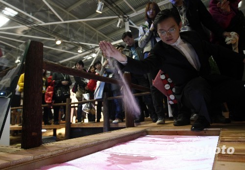 3月28日,沙画大师苏大宝在北京开幕的2010中国国际服装服饰博览会上现场作画,吸引参展者驻足观赏。第十八届中国国际服装服饰博览会(CHIC2010)设男装、女装、休闲装、童装等10个专业展区;汇聚了来自世界各地20多个国家和地区的1000余个品牌,呈现了当今国内外服装行业的发展态势与国际服装市场未来的趋势走向,是国内外服装企业市场开拓、品牌推广、商贸洽谈、国际交流的最佳商贸平台,估计观众超过10万,是亚洲地区最具规模与影响力的服装专业展会。