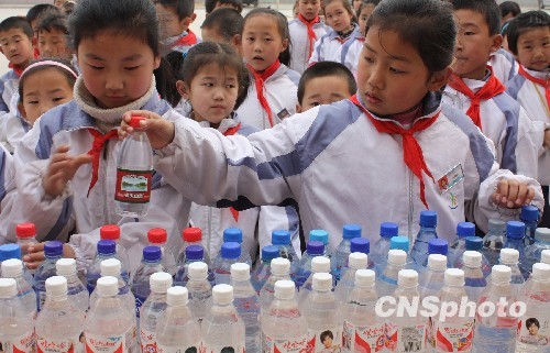 3月29日,山东省博兴县第三小学开展“一人一瓶水,爱心送旱区”特别行动,全校小学生积极为我国西南旱灾地区捐款、捐水,共同为支援灾区群众抗旱救灾奉献爱心。中新社发 陈彬 摄