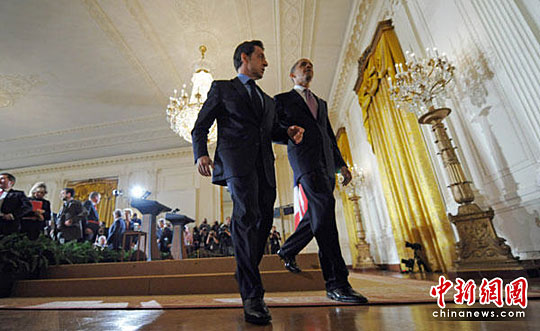 美国总统奥巴马(右)与到访的法国总统萨科齐在记者会后离开。
