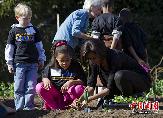 美国第一夫人米歇尔奥巴马和一群小学生一起种菜。