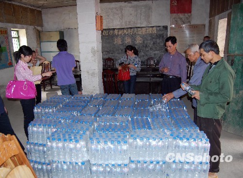 南宁职业技术学院建筑工程学院师生代表到广西旱区南宁市隆安县都结乡新风村开展送水献爱心活动,送去230多箱饮用水和4365.5元善款。中新社发 陈民 摄
