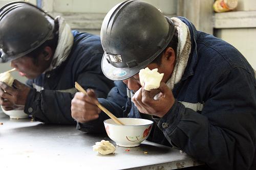 4月1日, 这两位救援人员正在吃晚饭,他们早上6点下井直至下午5点才上来。我问其中一位师傅的名字,他的眼里立即充满了泪花,并用手中馒头挡住脸。我实在不忍心再按下快门,便走到他身后,用手轻轻地拍拍他的后背,表示歉意。 高学余 摄