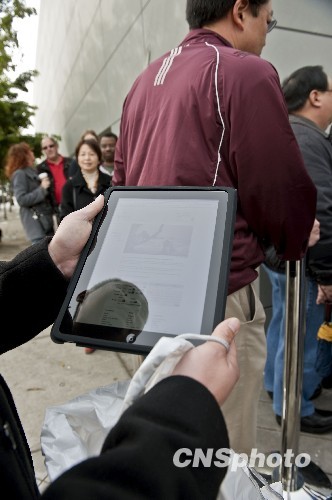 图为一位刚刚买到的ipad的顾客在排队的果迷前炫耀。中新社发 陈钢 摄