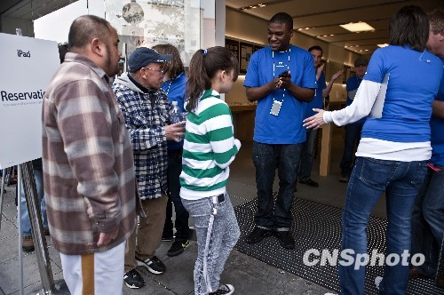 图为首位Ipad消费者进入加州苹果零售店,受到苹果店员们的列队欢迎。他们早上5点就来排队了。中新社发 陈钢 摄