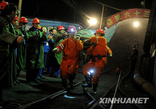 救援人员将一名获救矿工抬出井口。燕雁 摄