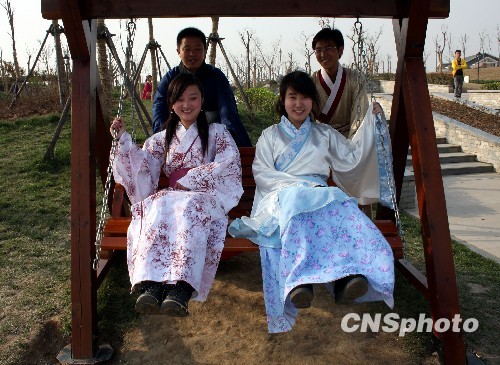 4月4日,通过网络结交崇尚汉文化的青年网友相约在枣庄东湖公园,一起切磋汉文化。当日,通过网络结交崇尚汉文化的14名青年网友,利用清明小长假相约在山东省枣庄东湖公园,身着汉服踏青交友,感受汉文化。 这14名青年网友来自江苏徐州和山东济宁、枣庄、青岛等地区,多数为大学毕业生和在校大学生。