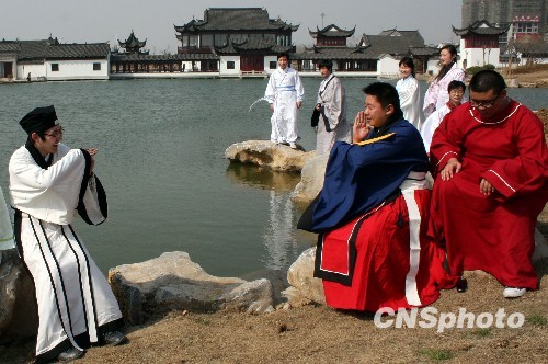 通过网络结交崇尚汉文化的青年网友相约在枣庄东湖公园,一起切磋汉文化。中新社发 吉喆 摄