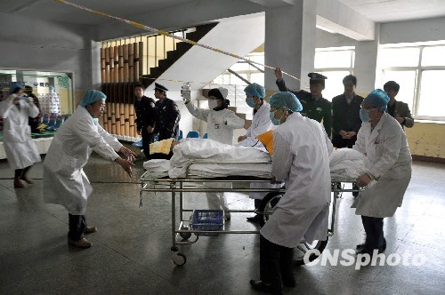 4月5日,山西铝厂职工医院医护人员快速运送获救工人。 刘普杰 摄