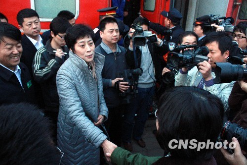 6日6时22分,山西省副省长张建欣在河津火车站站台与车站工作人员握手。当日,山西“3•28”透水事故获救的60名重症工人通过专列转运省城太原救治。中新社发 王卫平 摄