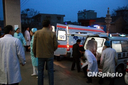 6日5时50分,在河津中心医院救治的“3.28”透水事故获救工人中的重症病人转运太原救治。 中新社发 王卫平 摄