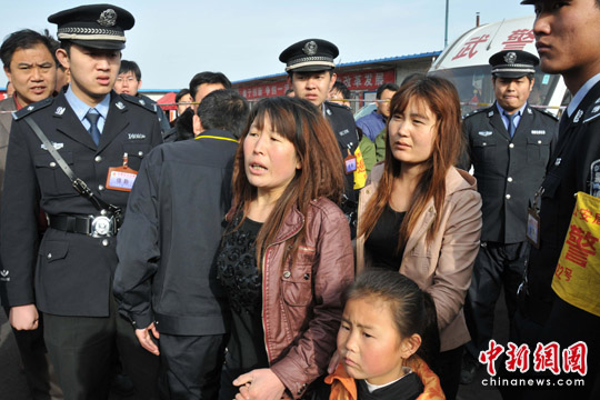 4月6日,一名被困矿工家属拉着自己的孩子的手走过安保警戒线。王家岭煤矿透水事故救援进入最后关头。中新社发 刘冬 摄