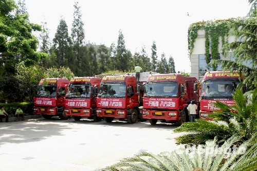 由山东寿光农副产品基地捐赠的100吨新鲜蔬菜,6日分五辆集装卡车运抵昆明,为云南旱区人民吃到新鲜蔬菜送来一份温暖和爱心。图为刚刚停稳满载蔬菜的集装卡车。中新社发 田洪 摄