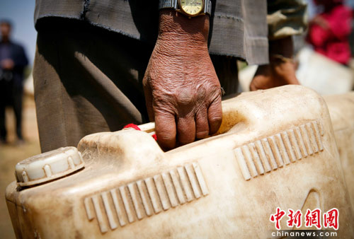 旱区民众的双手正如干裂的大地,需要水的滋润。大旱目前造成云南省828万人、1890万头牲畜饮水出现困难,全省农业直接经济损失已达170亿元。图为手提水桶的云南蒙自旱区民众。中新社发 刘冉阳 摄
