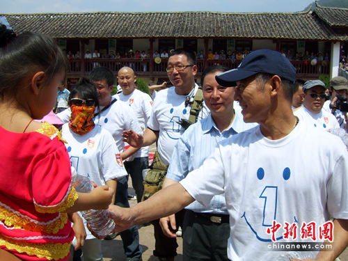 4月6日至7日,李连杰、明星义工文章亲自带领“壹基金救援联盟成员”与云南火峰救援队一起,来到云南省普洱市宁洱哈尼族彝族自治县磨黑镇,为当地受灾群众送去矿泉水、种苗等物资,并与当地群众一起种咖啡。图为李连杰(右)为受灾群众送上矿泉水。中新社发 杨颖融 摄