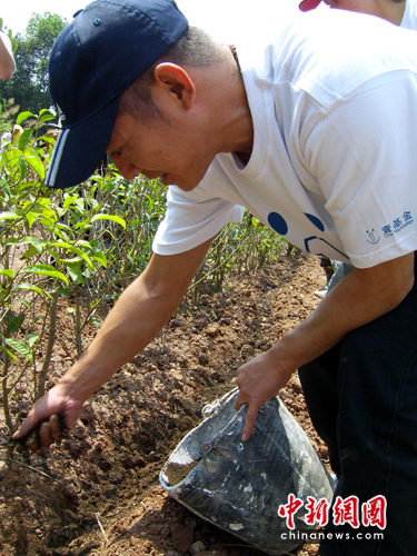 4月6日至7日,李连杰、明星义工文章亲自带领“壹基金救援联盟成员”与云南火峰救援队一起,来到云南省普洱市宁洱哈尼族彝族自治县磨黑镇,为当地受灾群众送去矿泉水、种苗等物资,并与当地群众一起种咖啡。图为李连杰亲自下田,给茶苗茶苗施保水剂。中新社发 杨颖融 摄