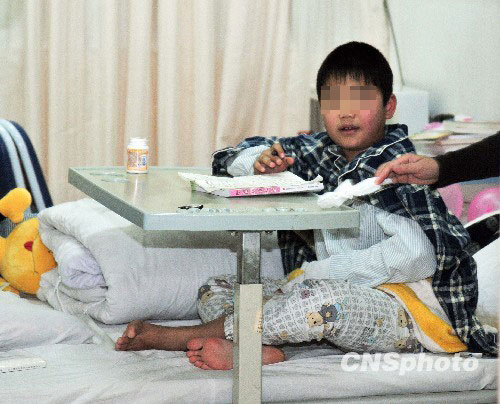南平凶案中受伤的10岁小男孩刘晓泳,正在写作业,白天接受老师的辅导,晚上正在温习功课。中新社发 张丽君 摄