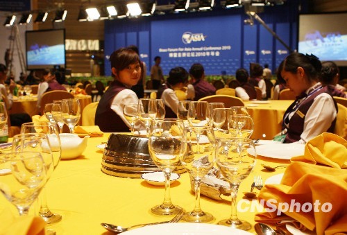 4月8日,博鳌亚洲论坛国际会议中心,工作人员正在会议大厅为论坛做准备。博鳌亚洲论坛2010年年会将于4月9日至11日在中国海南博鳌召开,本届论坛的主题是“绿色复苏,亚洲可持续发展的现实选择”。 中新社发 毛建军 摄