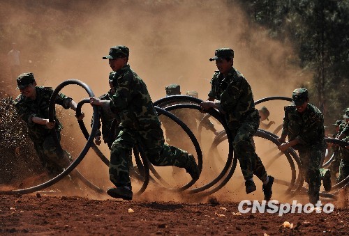 2010年4月8日至9日昆明警备区东川区人民武装部抗旱救灾突击队到达云南省昆明市东川区红土地镇所属各自然村帮助当地群众抗旱救灾。为使受灾群众早日用上“救命水”,昆明警备区东川区人民武装部领导带领抗旱突击队,以实战的姿态和打仗的标准投入抗旱救灾的攻艰战。图为4月9日下午,官兵们在海拔2500多米的高山上铺设输水管线。中新社发 吴苏琳 摄