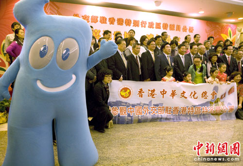 4月10日,外交部驻港特派员公署举行今年首次公众开放日活动,迎接即将揭幕的上海世博会。全国政协教科文卫体委员会副主任、香港中华文化总会会长高敬德,全国政协港澳台侨委员会副主任施祥鹏,全国人大代表袁武、梁刘柔芬等多名港区全国人大代表和政协委员,香港特区政府世博事务办公室主任陈子敬,以及香港中华文化总会200余名会员,一齐参加了此次以“喜迎世博 感知外交”为主题的活动。公署特派员吕新华介绍了上海世博会概况。图为嘉宾与参观者合影。中新社发 张勤 摄