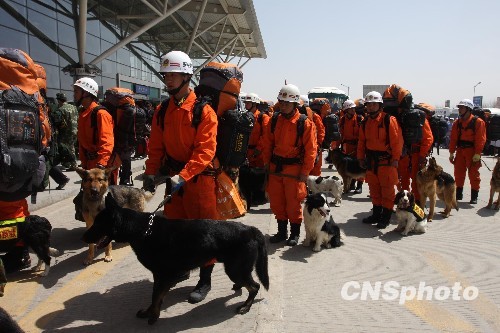 4月15日,山东救援人员带着搜救警犬赶到青海西宁机场,整理装备转往玉树地震灾区救援。 中新社发 郭国权 摄