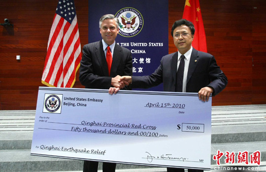 4月15日,美国驻华大使馆向中国红十字协会及青海省红十字协会各捐款五万美金。