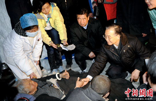 4月15日20时,中国国务院总理温家宝来到青海省玉树县玉树自治州医院看望受灾民众。这是温家宝握着一位藏族大妈的手问候其身体情况。国务院副总理回良玉、国务委员孟建柱参加看望慰问。