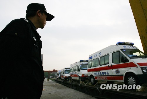 4月15日下午5时,在武汉市江岸货场,湖北省首批100余名急救人员乘坐列车奔赴青海玉树灾区。中新社发 周浩 摄
