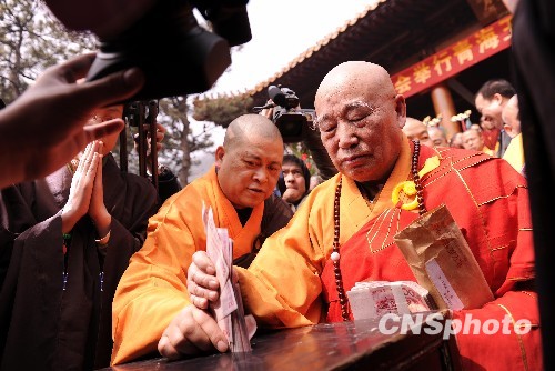 4月16日上午,中国佛教协会在北京灵光寺隆重举行“中国佛教协会为青海玉树地震灾区祈福回向暨捐款法会”。图为中国佛教协会会长传印长老为地震灾区捐款2万元。中新社发 刘震 摄