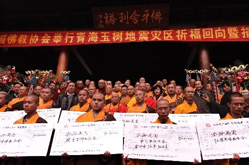 4月16日上午,中国佛教协会在北京灵光寺隆重举行“中国佛教协会为青海玉树地震灾区祈福回向暨捐款法会”,中国佛教协会会长传印长老、副会长学诚法师和副秘书长兼灵光寺方丈常藏法师共同捻香主法,中国佛教协会的法师、工作人员和首都佛教界信众,一千余人参加法会,并踊跃捐款。各地佛教协会代表和广大善信共捐款215万元人民币和100万日元。中新社发 刘震 摄
