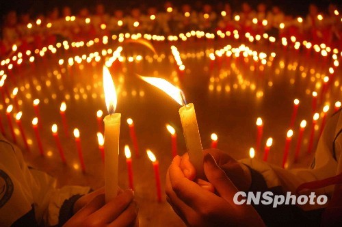河南省淮阳县外国语实验小学的学生点燃蜡烛用点点烛光为玉树灾区人民祈福。中新社发 杨正华 摄